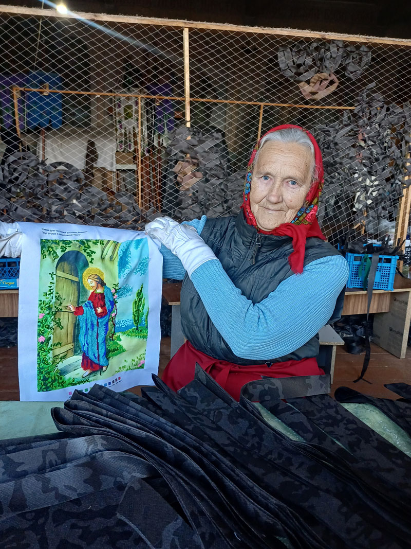 Марія Кравчик відповідає за замовлення сіток та обшиває їх шпагатом для зручного кріплення на позиції. Жінці – 72, працювала бібліотекарем в школі №6, де й досі працює на пів ставки. Тож після роботи завжди спішить до храму. Раніше, коли було більше роботи, на допомогу приходили й школярі.