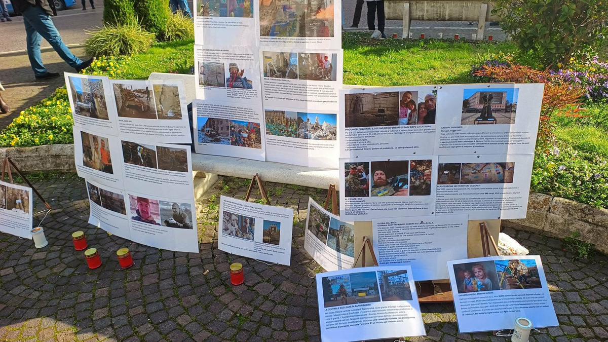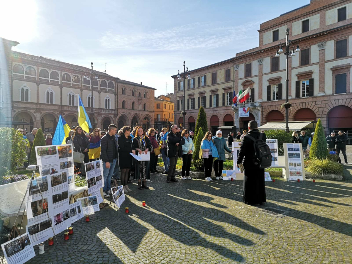 «Єдність, опір, воля. Пам’ятаємо, підтримуємо, молимося» – таким був девіз нашого заходу, який відбувся на центральній площі міста Форлі Piazza Aurelio Saffi. Постійно зупинялися люди. Підходили знайомі і незнайомі, читали, розпитували, просили розповісти більше. Дехто довго стояв мовчки біля світлин.